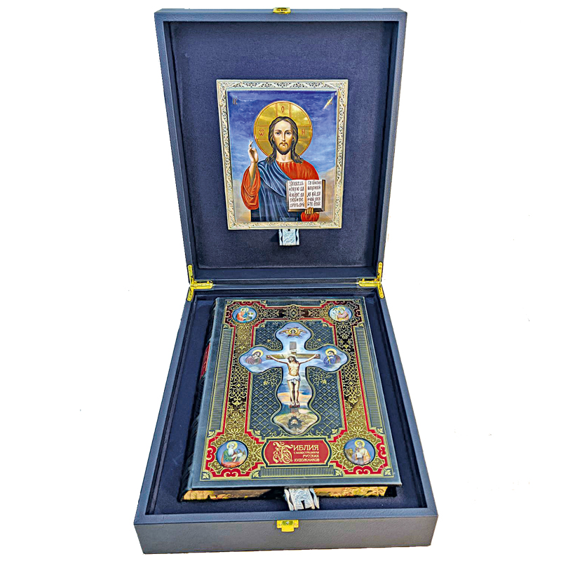 Библия с иллюстрациями русских художников (5 инкрустаций – ростовская финифть) в ларце с иконой