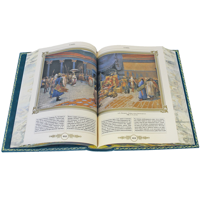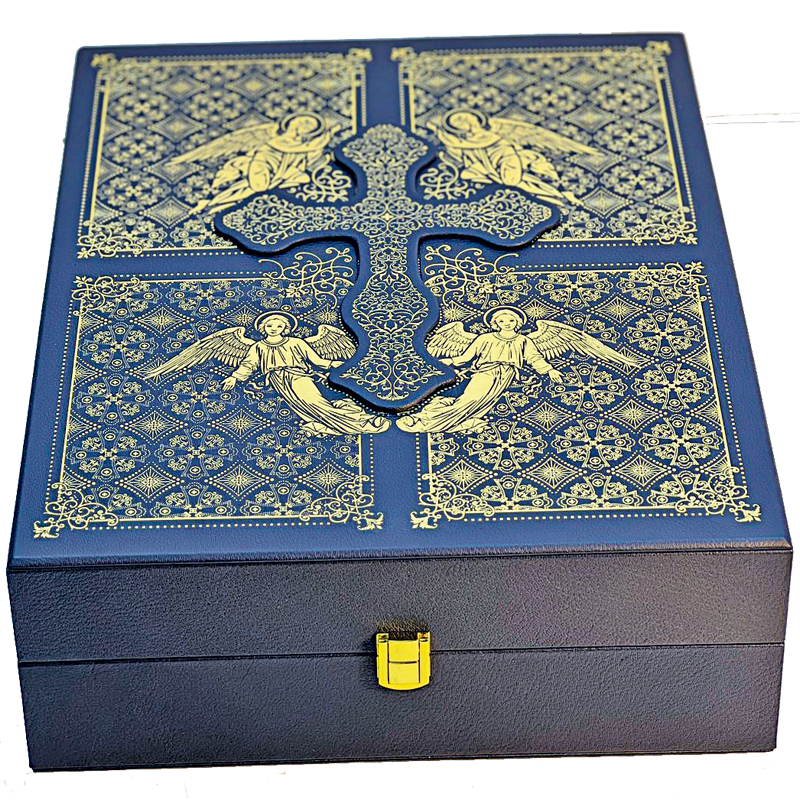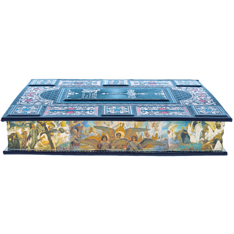 Издание и ларец роскошно оформлены. Библия переплетена в натуральную кожу особой выделки с золотым тиснением и 5 инкрустациями ростовской финифти ручной росписи и уложена в изящный подарочный ларец с иконой, так же выполненной в технике ростовской финифти ручной работы. Такая великолепно оформленная Библия станет подлинной семейной реликвией или роскошным подарком для христианина!