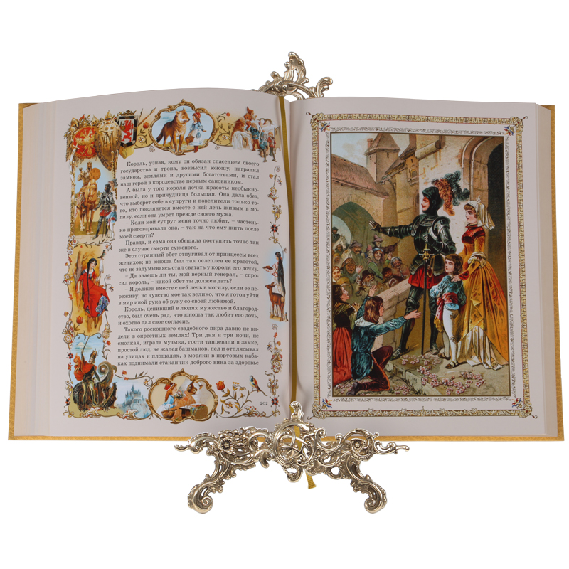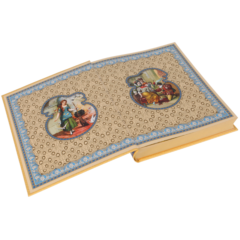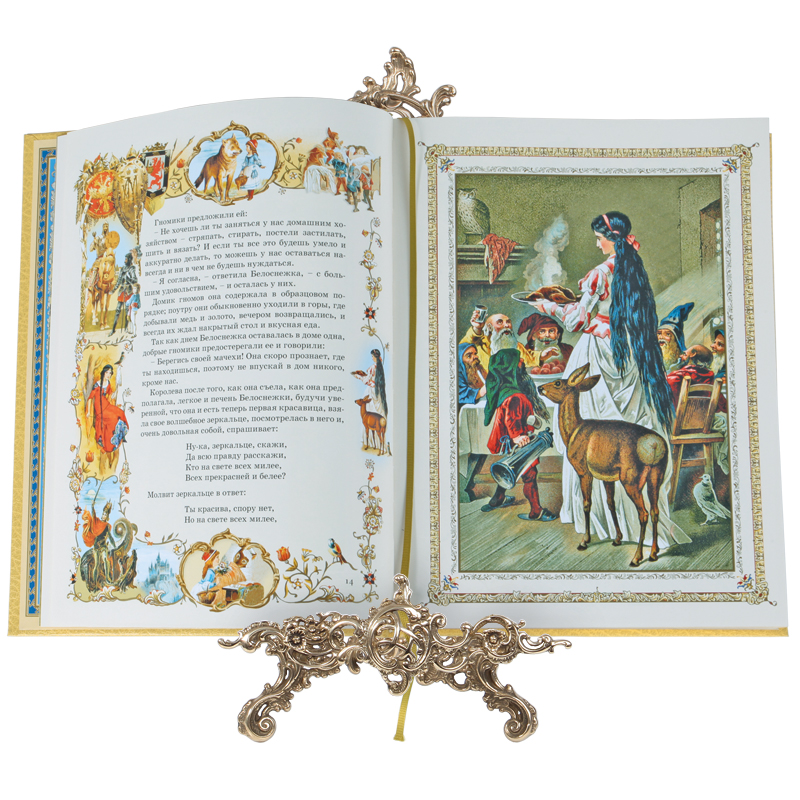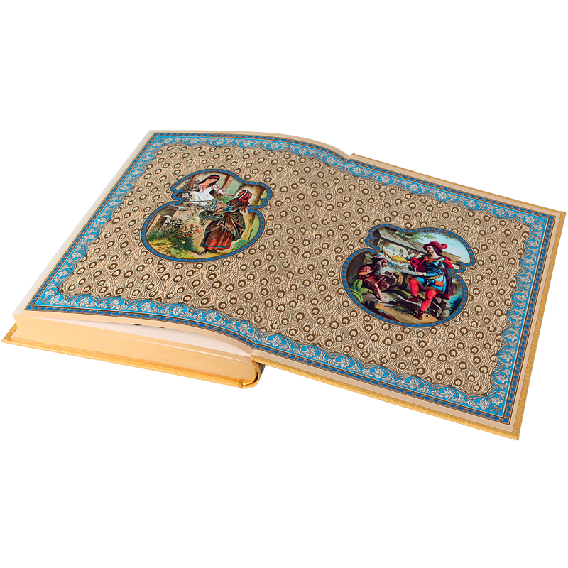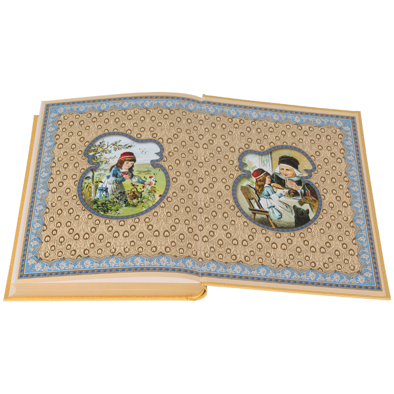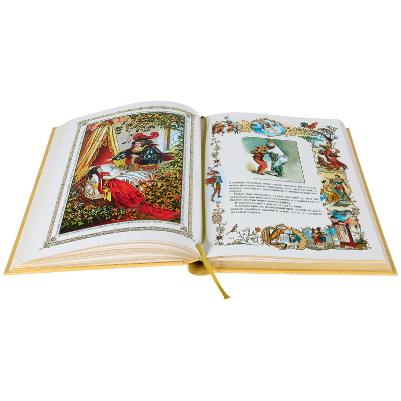 Книжный блок – мелованная бумага, цветные иллюстрации, зеркальные золотые обрезы.