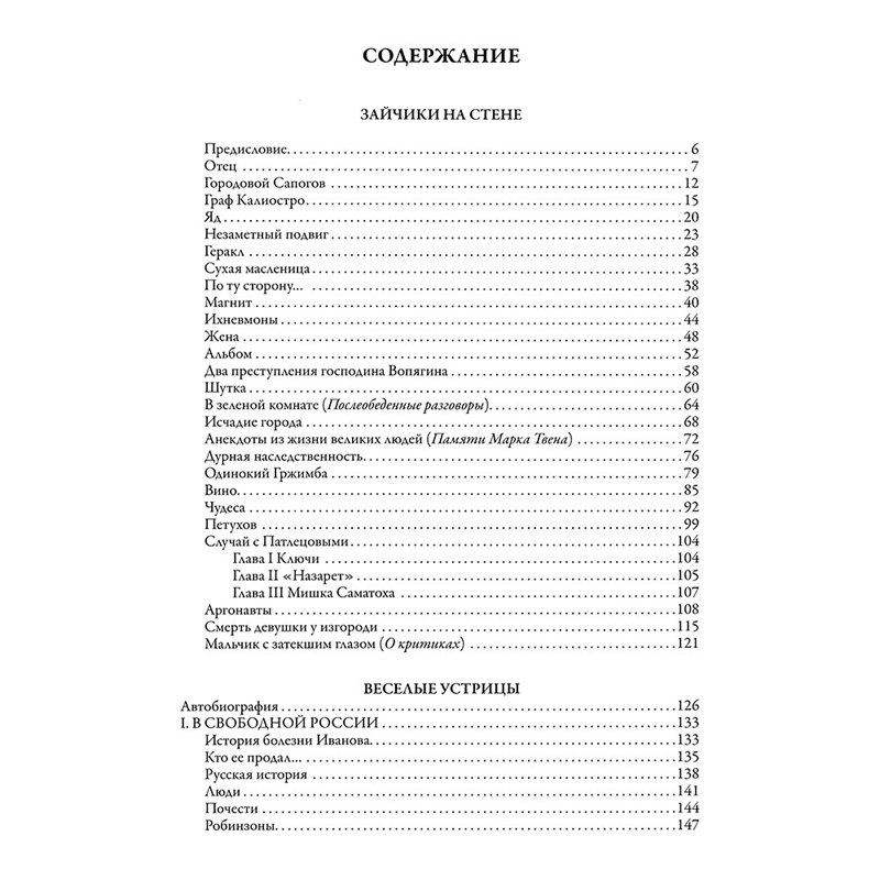 Издание включает 7 сборников писателя: «В свободной России» и «Около искусства», «Круги по воде» и «Зайчики на стене», «Дюжина ножей в спину революции», «Что им нужно» и «Записки театральной крысы», а так же отдельные рассказы и автобиографию писателя.. Иллюстрируют книгу работы сотрудников журналов «Сатирикон» и «Новый Сатирикон». Не упустите и Вы возможность получать удовольствие от этого бьющего через край остроумия!