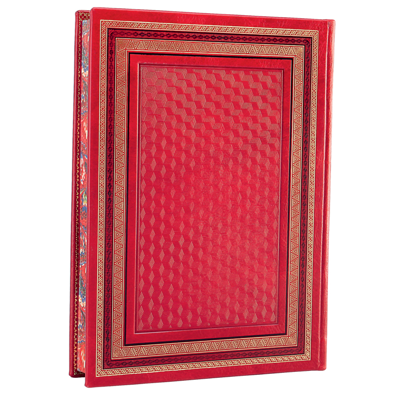 Переплет ручной работы из натуральной кожи, разноуровневые объемные тиснения золотой фольгой и блинтом, круглёный корешок с бинтами, форзацы – дизайнерская бумага, золотая дублюра, ляссе.