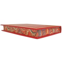 Переплет ручной работы из натуральной кожи, разноуровневые объемные тиснения золотой фольгой и блинтом, круглёный корешок с бинтами, форзацы – дизайнерская бумага, золотая дублюра, ляссе.