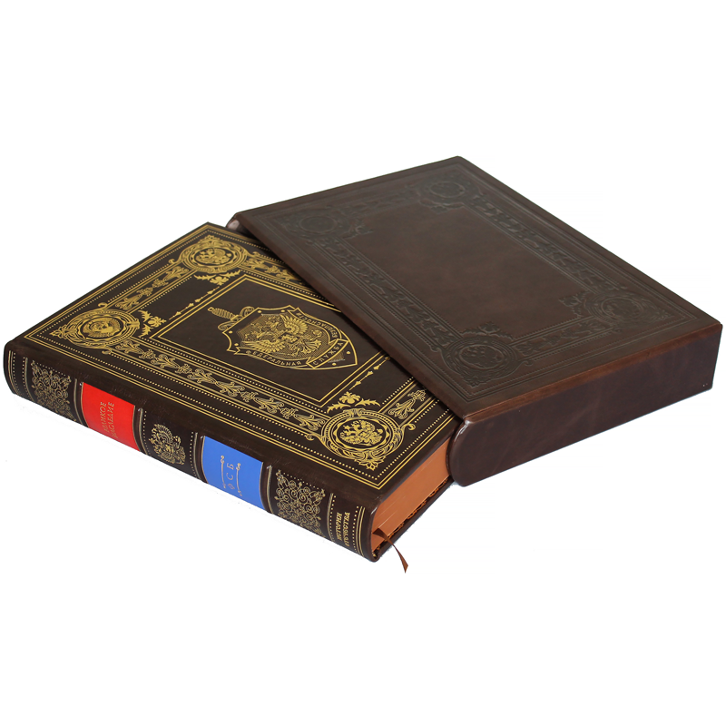 Переплет и футляр ручной работы из натуральной кожи, тиснение золотом и блинтом, корешок с бинтами, дублюра, составные форзацы, ляссе.