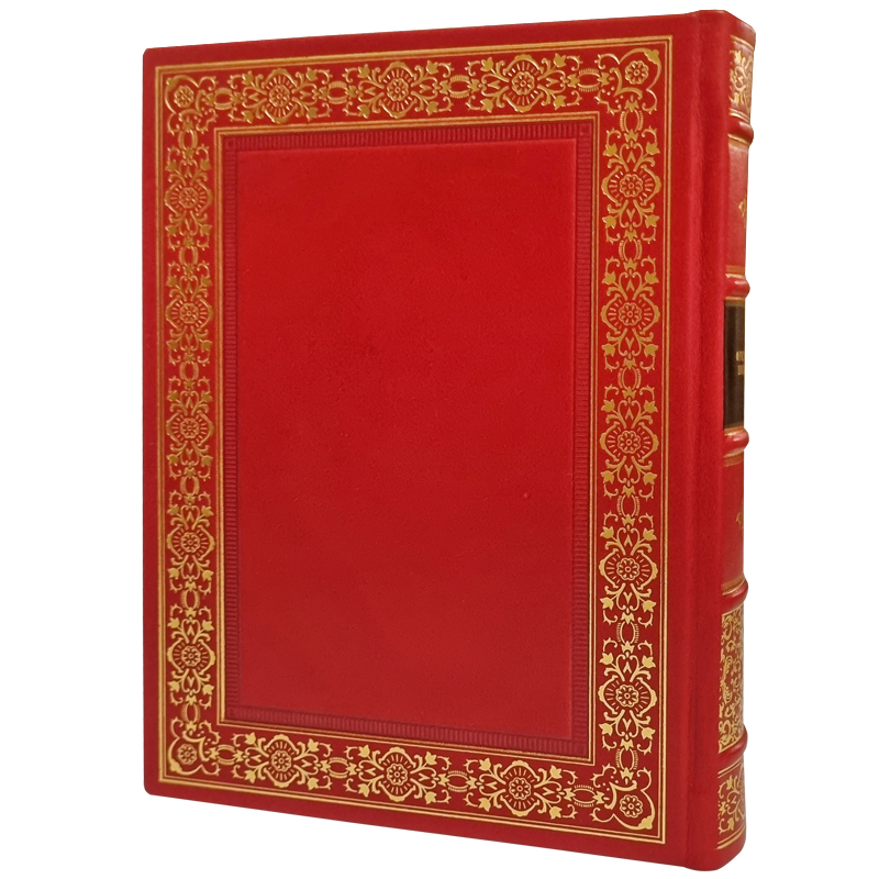 Переплет ручной работы из натуральной кожи, тиснение золотом, черным пигментом и блинтом, корешок с бинтами, золотая дублюра, форзацы – дизайнерская бумага, ляссе.