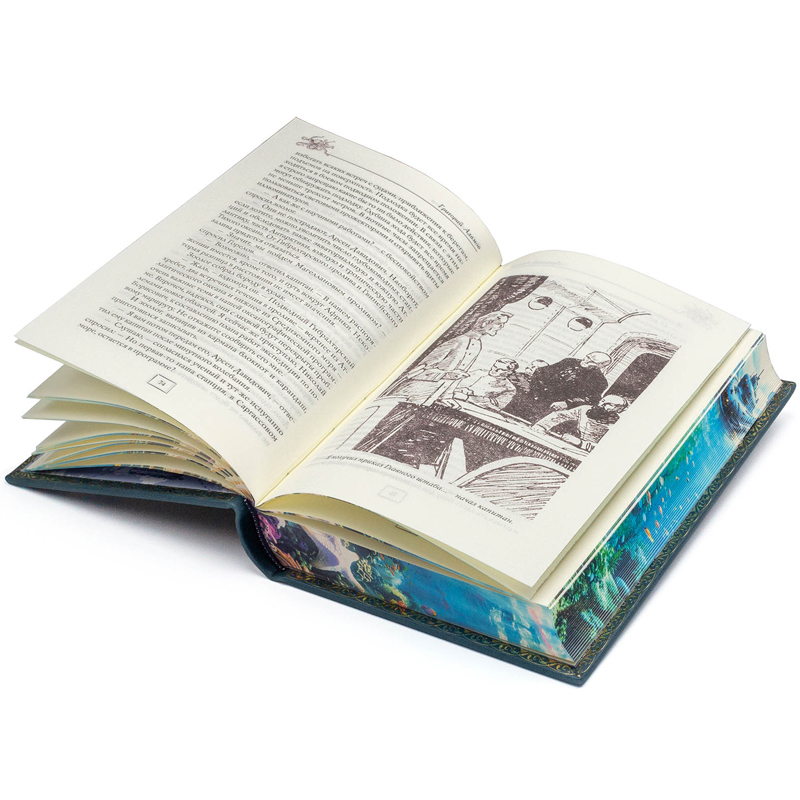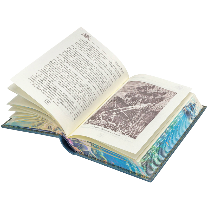 Книжный блок – чёрно-белые иллюстрации, обрезы расписаны иллюстрациями.