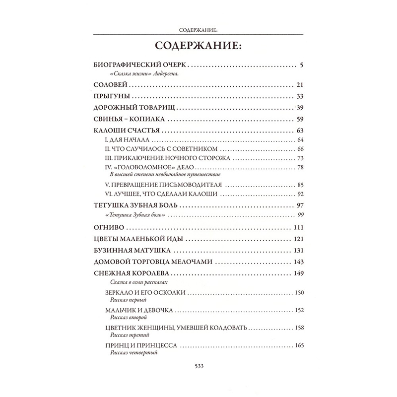 Это собрание 43 давно ставших классикой сказок великого датчанина в переводе начала ХХ века Анны и Петра Ганзен: «Гадкий утенок» и «Огниво», «Стойкий оловянный солдатик» и «Снежная королева», «Оле-Лукойе» и «Дюймовочка», «Русалочка» и «Калоши счастья», «Принцесса на горошине» и многие другие. Открываешь книгу – и величественная Дева Льдов протягивает к тебе холодные пальцы из голубовато-зеленой горной реки, умные мышки варят суп из колбасной палочки, а девочка, наступившая на хлеб, попадает в пивоварню эльфов. Издание украшают 280 иллюстраций датского художника Ганса Тегнера
