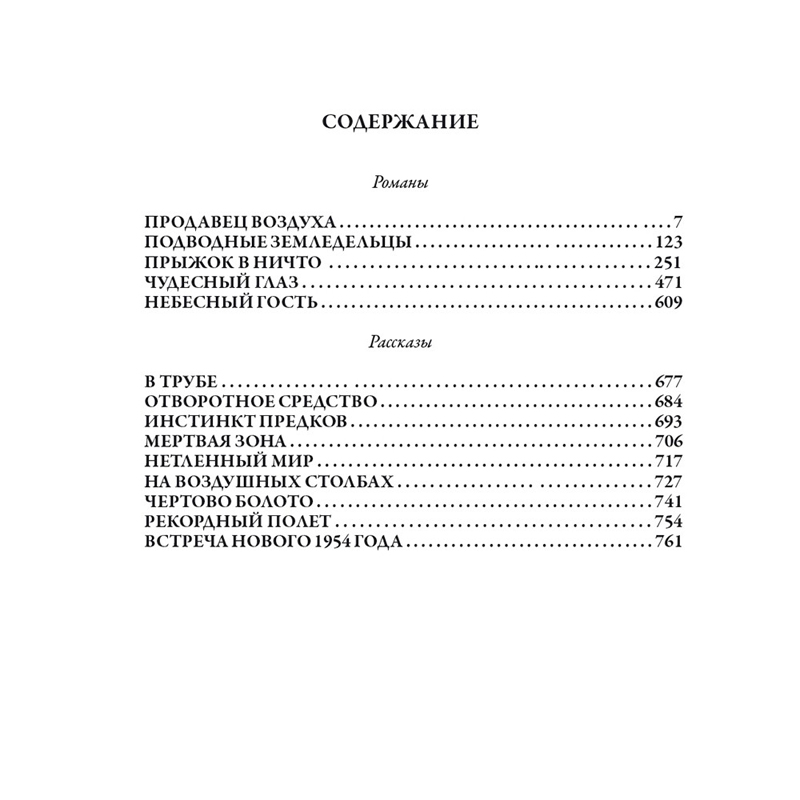 Издание включает 4 романа «Продавец воздуха», «Подводные земледельцы», «Небесный гость» и посвященный К.Э. Циолковскому «Прыжок в ничто», новый перевод на русский язык романа «Чудесный глаз», который был написан Беляевым на украинском, а также 9 рассказов писателя.
