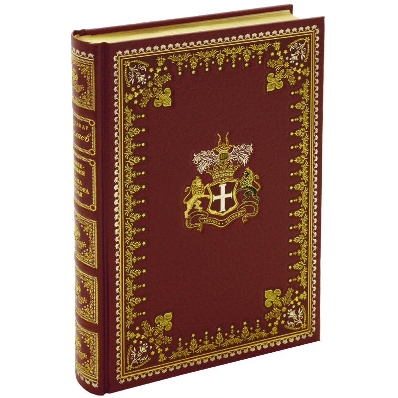 Переплет – экокожа, многослойное тиснение золотом, серебром и цветной фольгой, кругленый корешок, форзацы – дизайнерская бумага, ляссе.