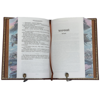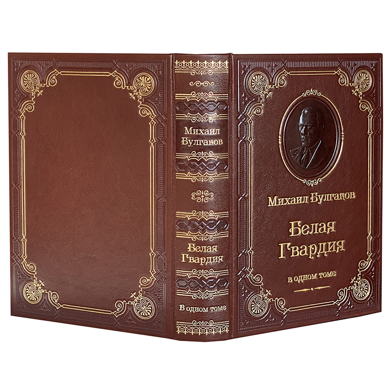 Переплёт из натуральной кожи ручной работы, тиснение золотом, конгревно-блинтовое глубокое тиснение, медальон с портретом автора (высокое конгревное тиснение), круглёный корешок, дублюра, форзац составной из дизайнерской бумаги, ляссе.