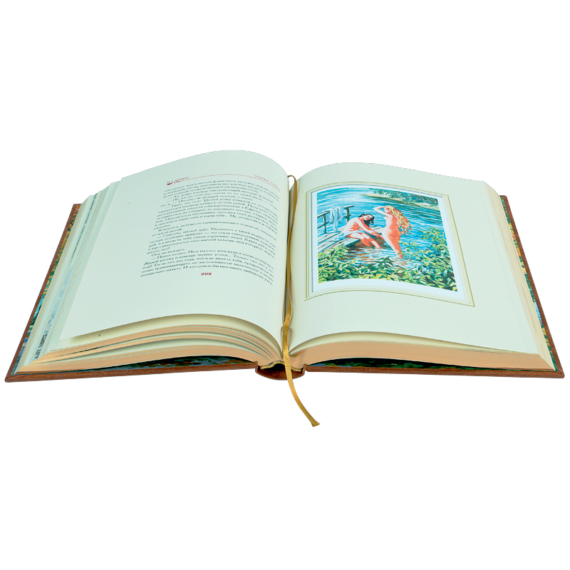 Книжный блок – тонированная мелованная бумага, цветные иллюстрации, золотые зеркальные обрезы.
