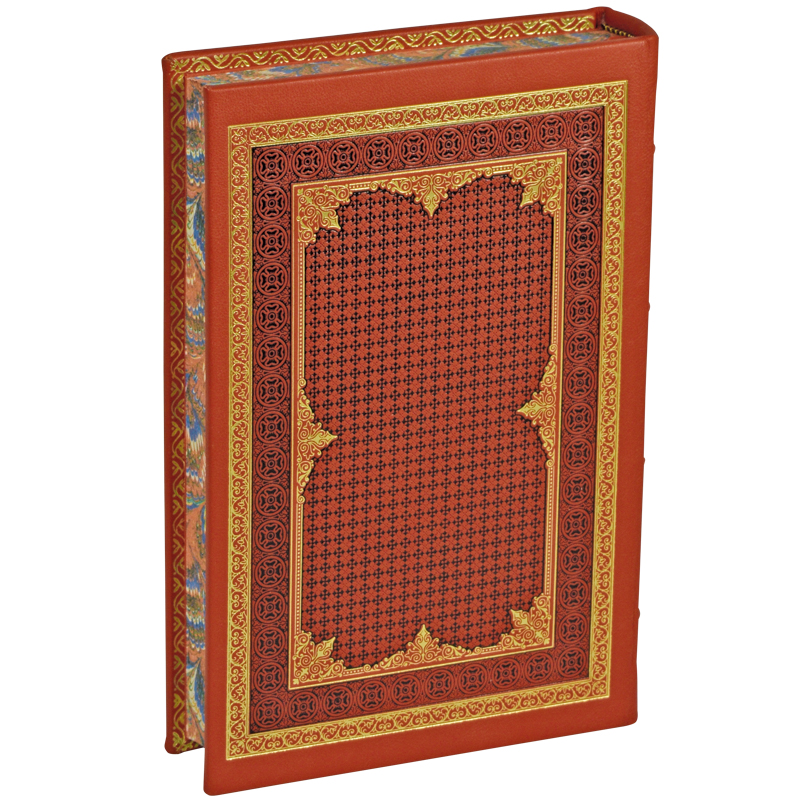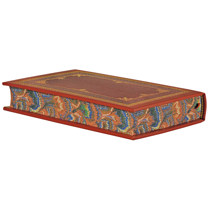 Переплёт ручной работы из натуральной кожи, тиснение золотом и блинтом, круглёный корешок с бинтами, золотая дублюра, форзацы – дизайнерская бумага, ляссе.