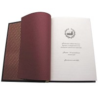 Европейский переплет ручной работы из натуральной кожи, тиснение золотом, блинтом и цветным пигментом, иллюстративная инкрустация, круглёный корешок с бинтами, форзацы с золотой гравировкой, ляссе.