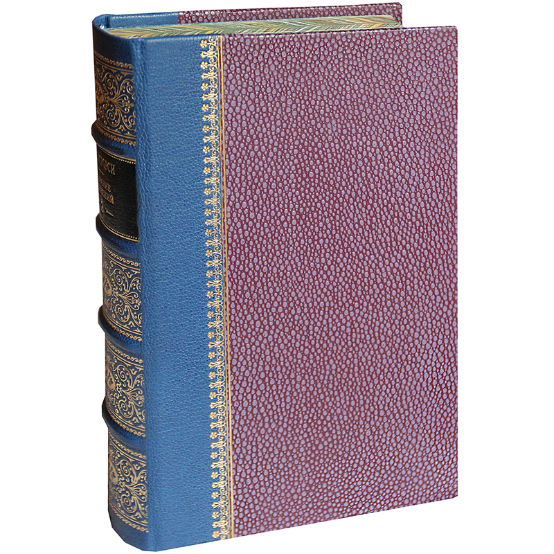 Составной кожаный переплёт ручной работы, тиснение золотом и блинтом, круглёный корешок с бинтами и инкрустацией, золотая дублюра, форзацы – дизайнерская бумага, ляссе.
