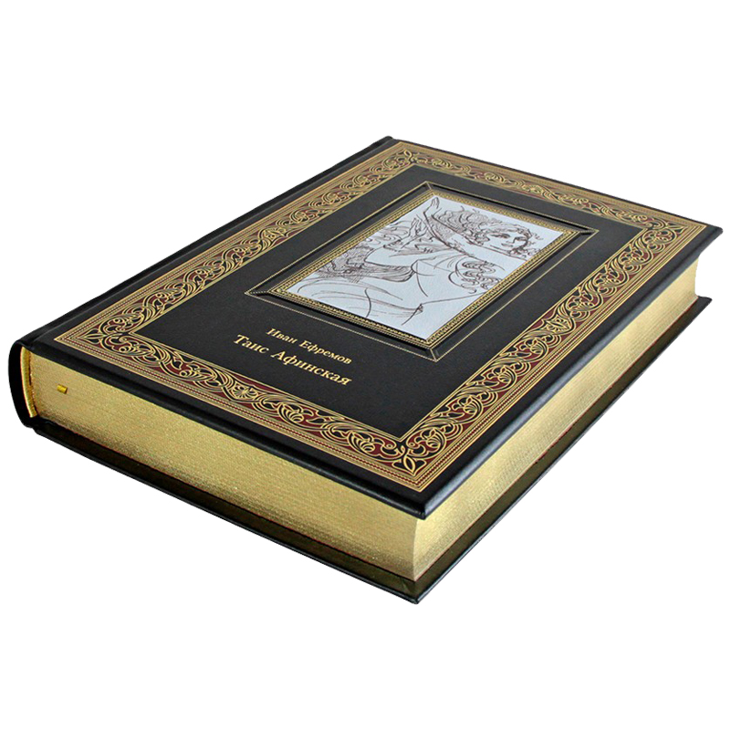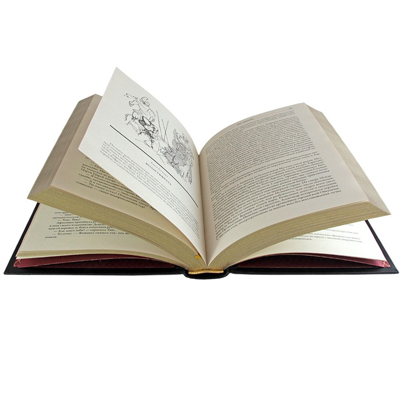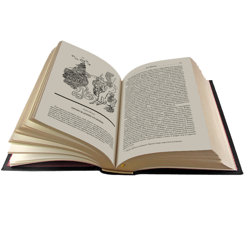Книжный блок – тонированная кремовая бумага, черно-белые иллюстрации, золотые торшонированные обрезы.