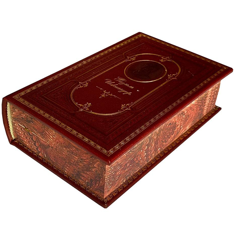 Переплет ручной работы из натуральной кожи, тиснение золотом и блинтом, кругленый корешок с бинтами, золотая дублюра, форзацы – дизайнерская бумага, ляссе.