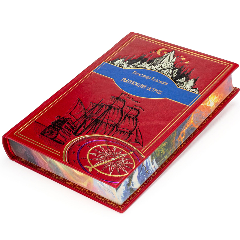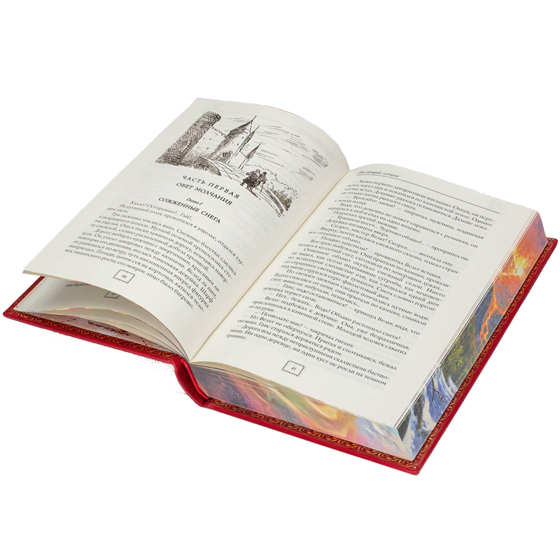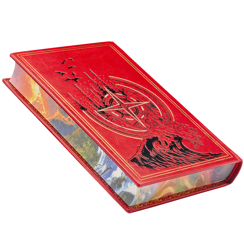 Переплёт ручной работы из натуральной кожи, тиснение золотом и цветными пигментами, круглёный корешок с бинтами, иллюстративные форзацы, золотая дублюра.