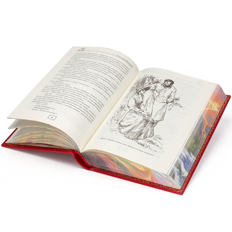 Книжный блок – дизайнерская бумага, черно-белые иллюстрации, обрезы расписаны иллюстрациями.