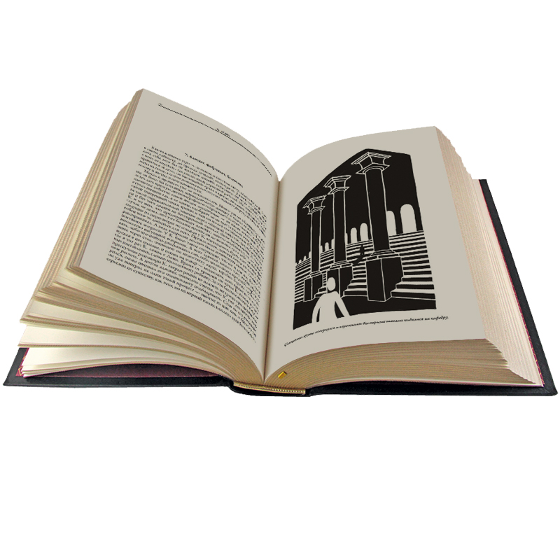 Книжный блок – кремовая тонированная бумага, черно-белые иллюстрации, золотые торшонированные обрезы.