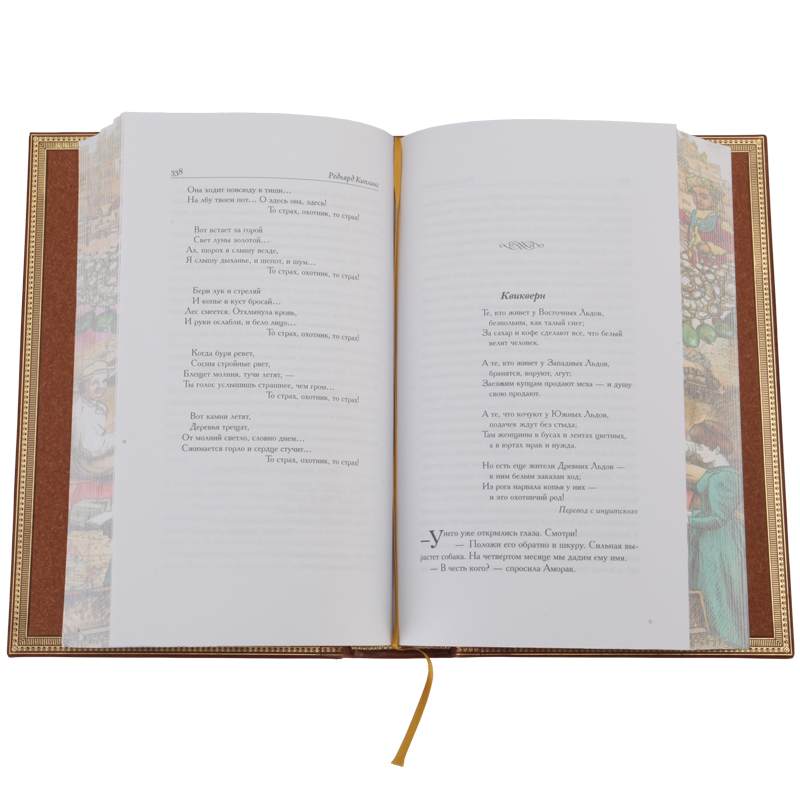 Переплёт ручной работы из натуральной кожи, тиснение золотом и конгревно-блинтовое тиснение, медальон с портретом автора – высокое конгревное тиснение, ручная роспись по коже, круглёный корешок с бинтами, дублюра, составной форзац на дизайнерской бумаге со слизурой, ляссе.