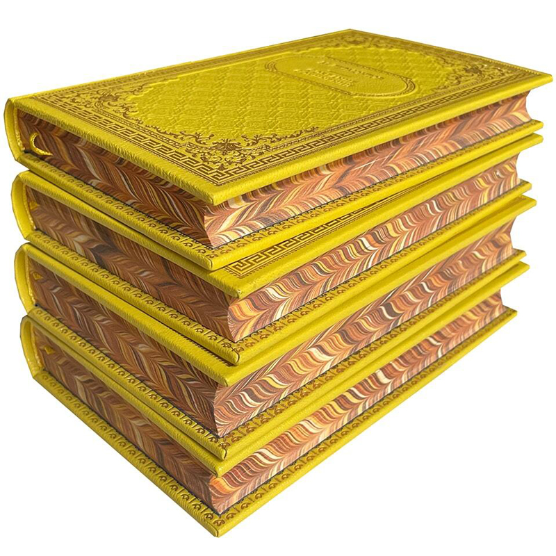 Переплет ручной работы из натуральной кожи, тиснение золотом и блинтом, круглёный корешок с бинтами и инкрустацией, форзацы – дизайнерская бумага, золотая дублюра, ляссе.