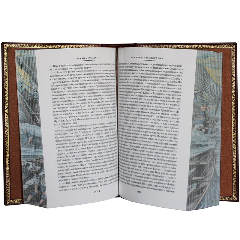 Качаешься на волнах. Чувствуешь безмерность океана. Уходишь за пределы повседневности. Кругом все затихает, чтобы вместе с тобой вслушиваться в биение пульса планеты. В руках – книга-символ, книга-вызов! Пустившись в плавание на китобойном судне, внимаешь гениальному писателю, который, подробно живописуя мир морских великанов и корабельный быт тех, кто на них охотится, дерзко, смело, глубоко и всеобъемлюще рассказывает о Человеке и человечестве. Только на первый взгляд – это история о смертельном противостоянии отважного капитана Ахава и гигантского белого кита, олицетворяющего мировое зло. Завораживает и пугает белый цвет, загадка вселенной овладевает целиком, когда стоишь на мачте над безмолвной палубой, словно шагая по бездонной пучине на гигантских ходулях, а внизу, точно корабли, проплывают огромные морские чудовища…