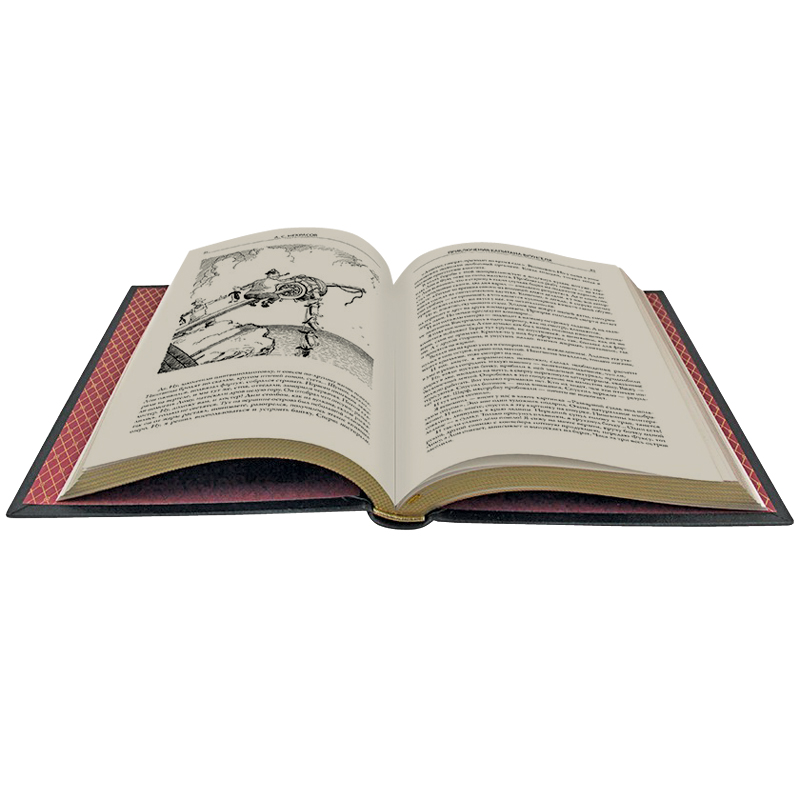 Книжный блок – кремовая тонированная бумага, чёрно-белые иллюстрации, золотые торшонированные обрезы.