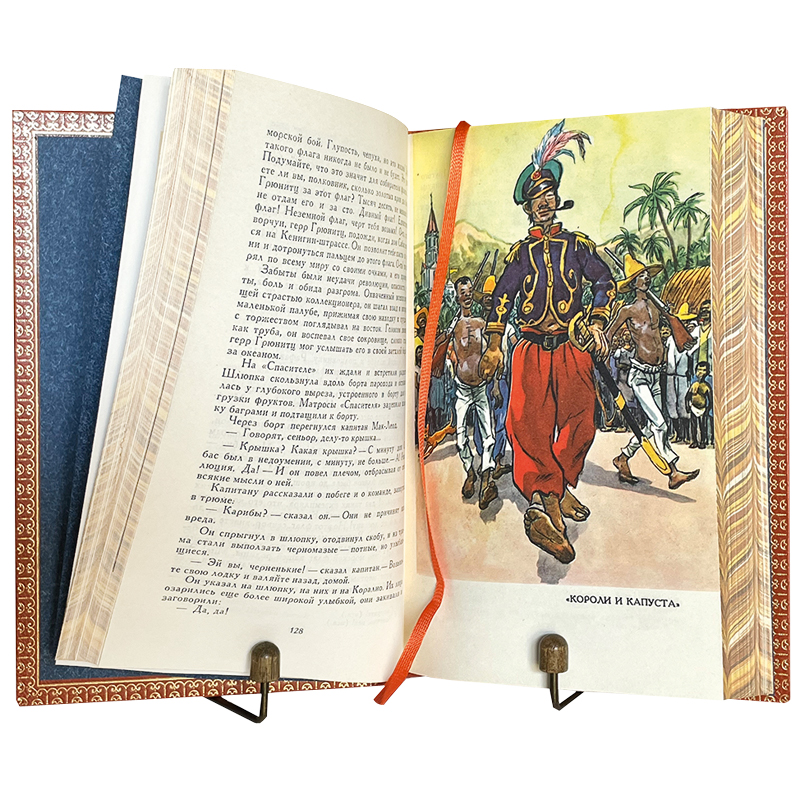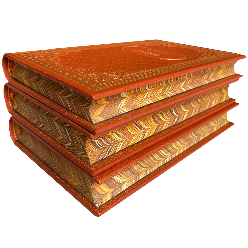 Переплёт ручной работы из натуральной кожи, тиснение золотом и блинтом, круглёный корешок с бинтами и инкрустацией, форзацы – дизайнерская бумага, золотая дублюра, ляссе.