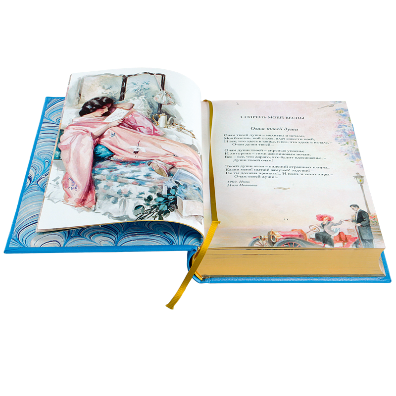 Книжный блок – мелованная бумага, цветные иллюстрации, зеркальные золотые обрезы.