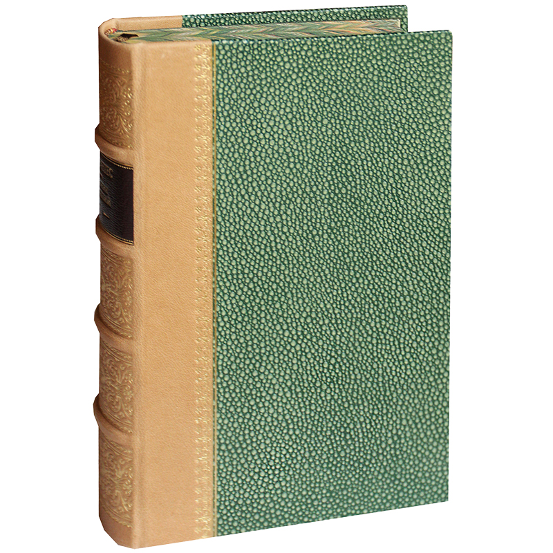 Составной кожаный переплёт ручной работы, тиснение золотом и блинтом, круглёный корешок с бинтами и инкрустацией, золотая дублюра, форзацы – дизайнерская бумага, ляссе.