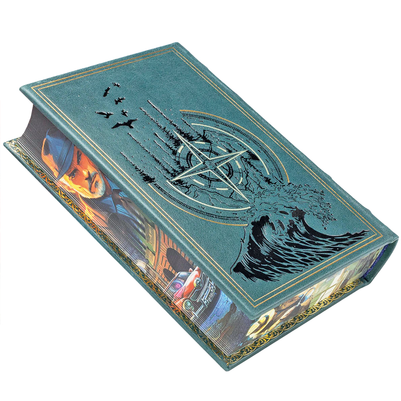 Переплёт ручной работы из натуральной кожи, тиснение золотом и цветными пигментами, круглёный корешок с бинтами, иллюстративные форзацы, золотая дублюра.