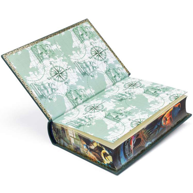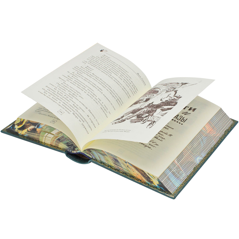 Книжный блок – дизайнерская бумага, чёрно-белые иллюстрации, обрезы расписаны иллюстрациями.
