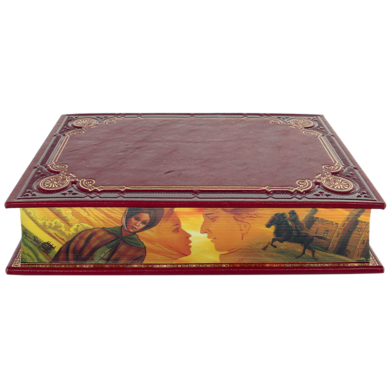 Переплёт ручной работы из натуральной кожи, тиснение золотом, конгревно-блинтовое глубокое тиснение, медальон с портретом автора (высокое конгревное тиснение), круглёный корешок, составной форзац из дизайнерской бумаги, золотая дублюра, ляссе.