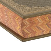 Переплет ручной работы из натуральной кожи, тиснение золотом, разноуровневое блинтовое тиснение, кругленый корешок с бинтами и инкрустацией, дублюра, форзацы – дизайнерская бумага, ляссе.