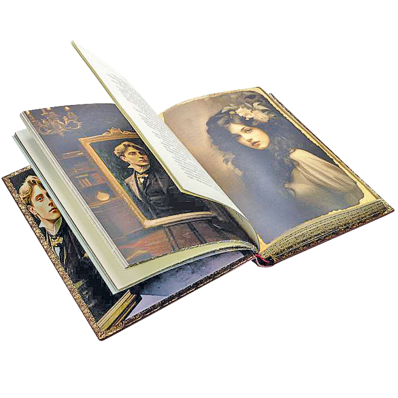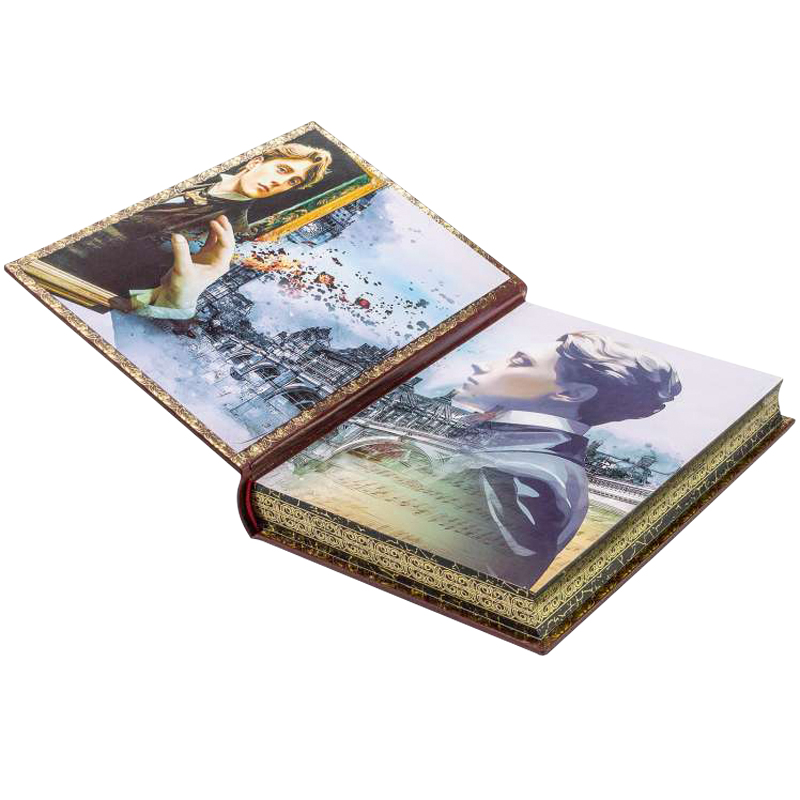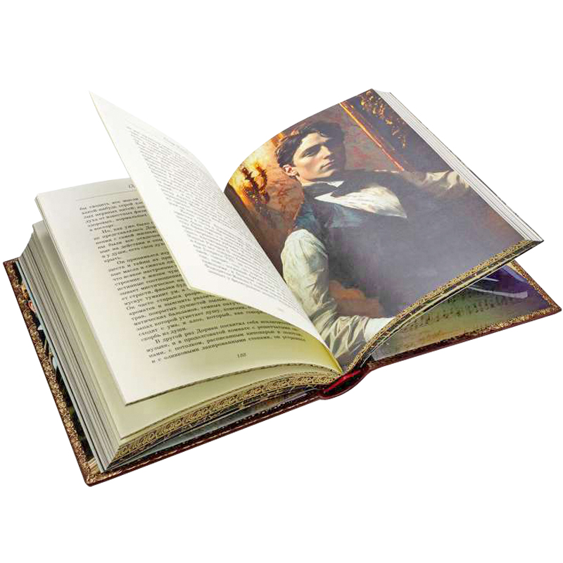 Книжный блок – дизайнерская бумага, цветные иллюстрации, тонированные обрезы с золотой гравировкой.