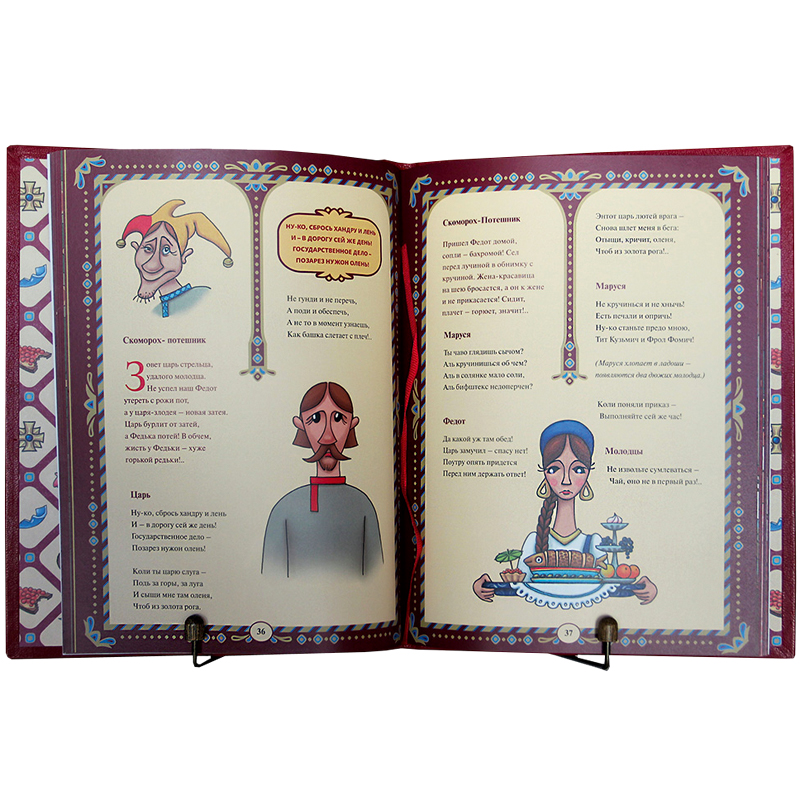 Книжный блок – мелованная бумага, цветные иллюстрации, орнаментально расписанные обрезы.