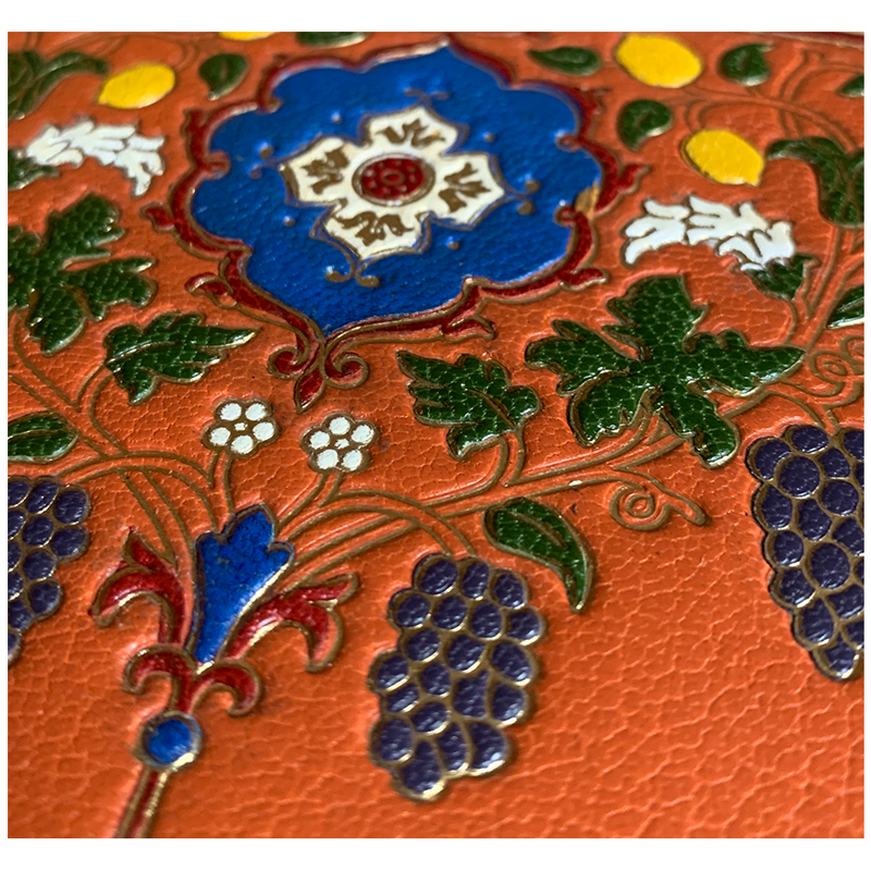 Французский переплет ручной работы, инкрустации из разноцветной кожи, тиснение золотом, кругленый корешок с бинтами, дублюра, форзацы – дизайнерская бумага.