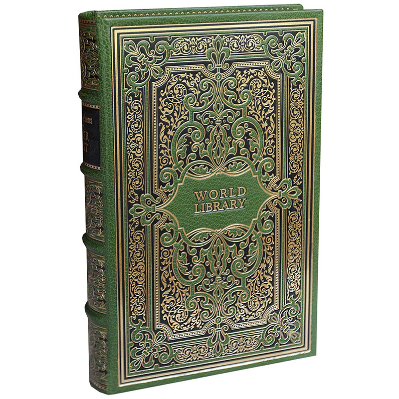 Переплёт ручной работы из натуральной кожи, тиснение золотом, чёрной фольгой и блинтом, круглёный корешок с бинтами, золотая дублюра, форзацы – дизайнерская бумага, шёлковое ляссе.