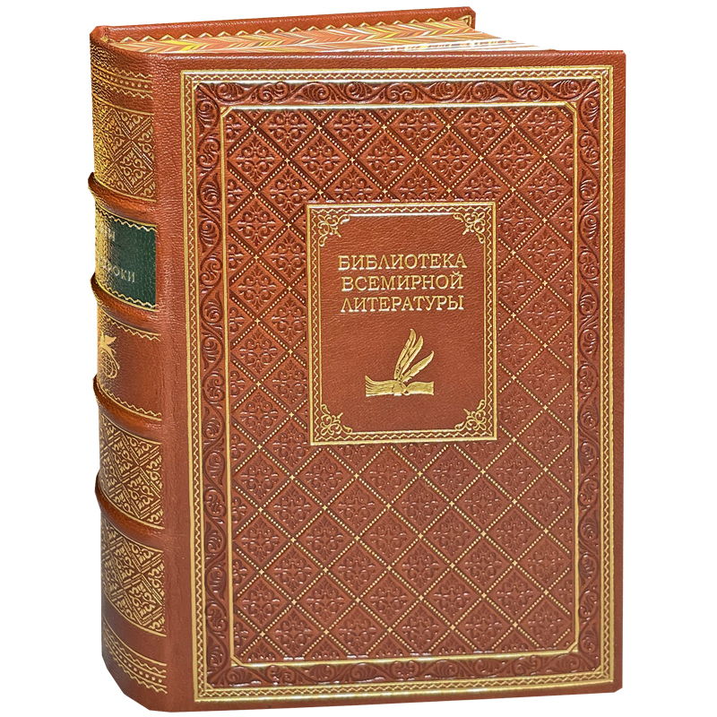 Переплёт ручной работы из натуральной кожи, объёмное золотое и блинтовое тиснение, круглёный корешок с бинтами, золотая дублюра, форзацы – дизайнерская бумага, шёлковое ляссе.